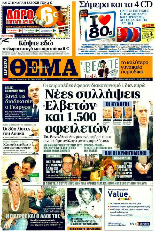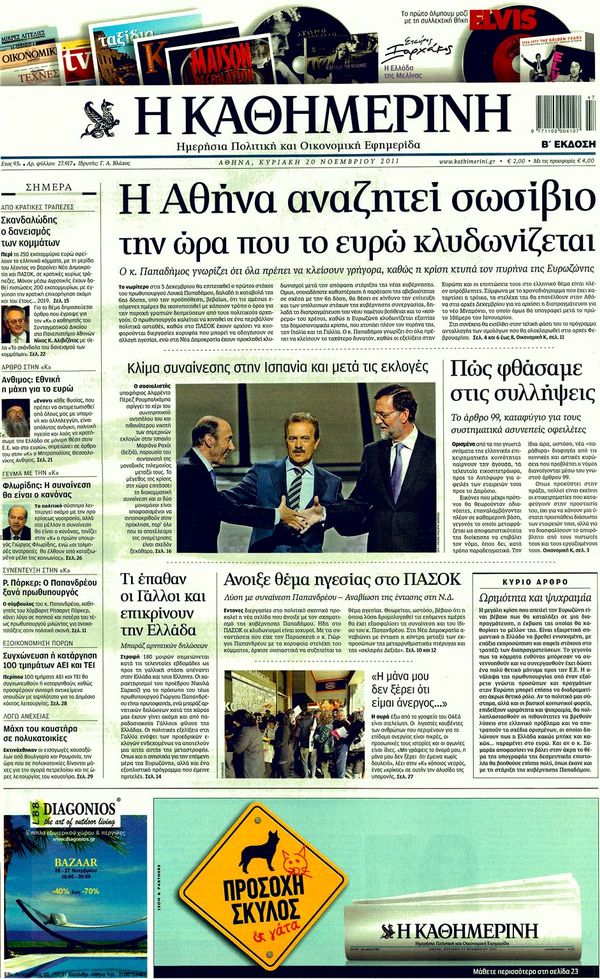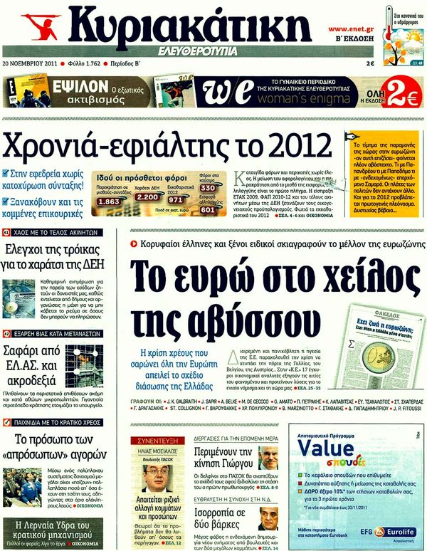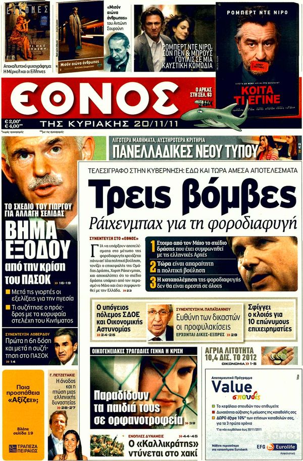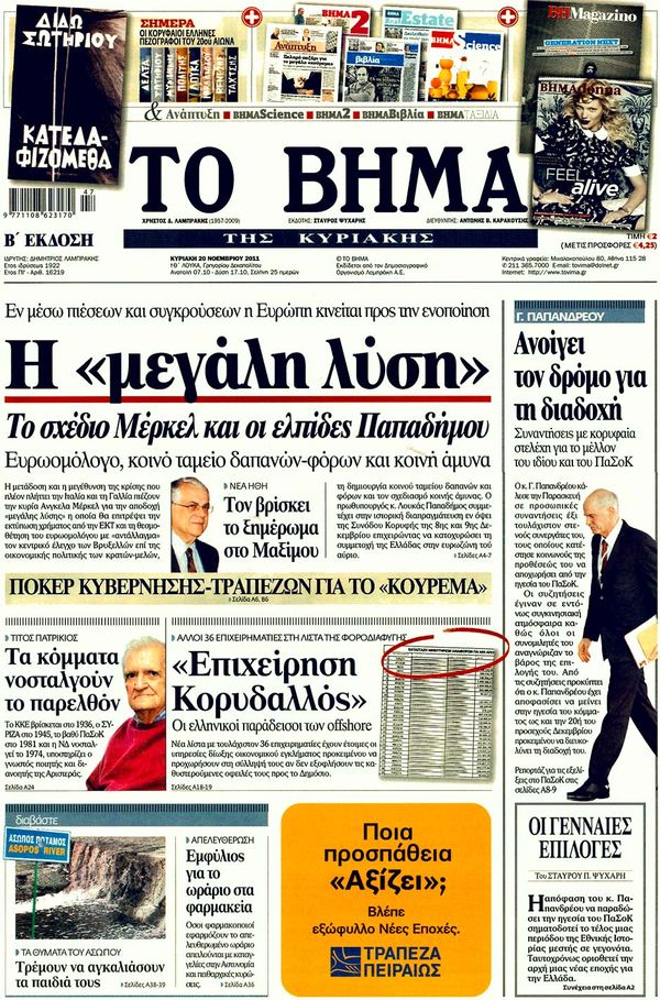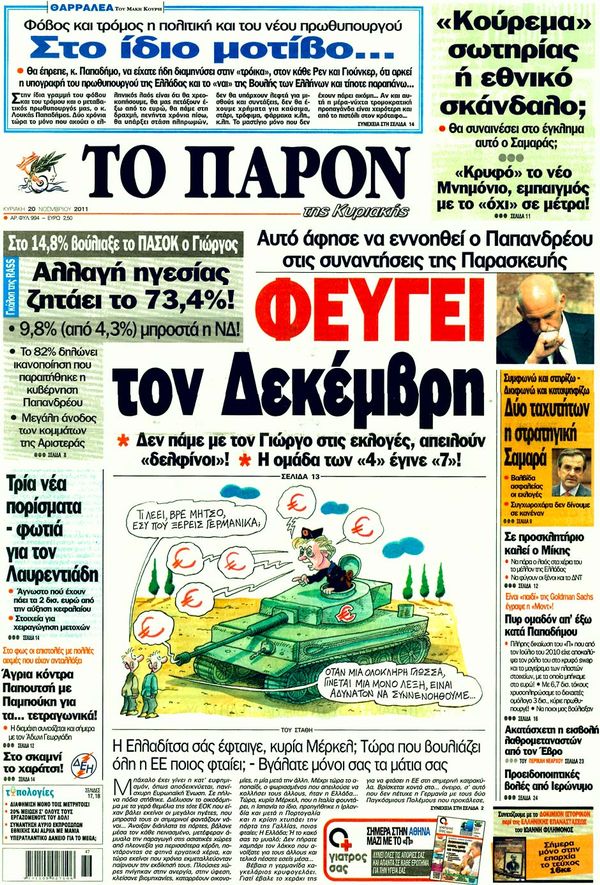 Για το σχέδιο της Μέρκελ και τις ελπίδες Παπαδήμου καθώς και για τους κλυδωνισμούς που υφίσταται το ευρώ κάνουν λόγο στα πρωτοσέλιδα τους οι περισσότερες Κυριακάτικες εφημερίδες.