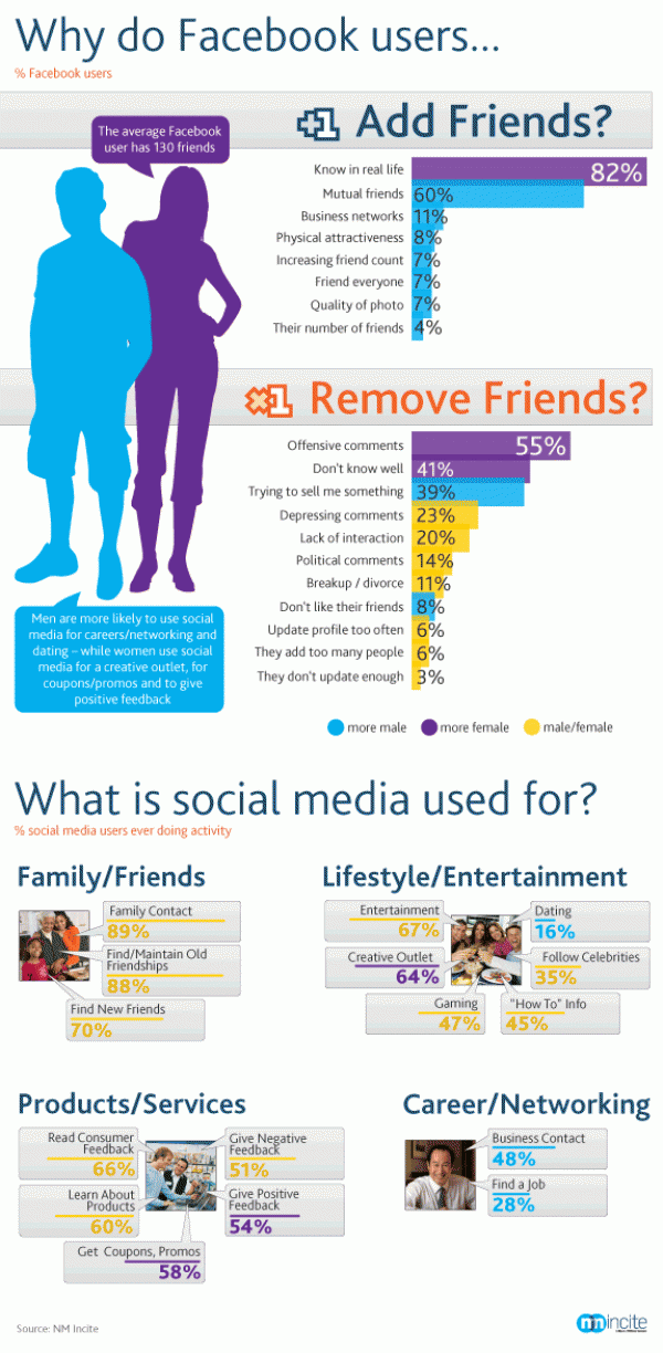 Σύμφωνα με μία μελέτη της NC Incite, μίας εταιρεία που ανήκει στην Nielsen ΜcKinsey, ο νούμερο ένα λόγος προσθήκης ενός ατόμου στο Facebook είναι επειδή τον γνωρίζουμε από την πραγματική ζωή ενώ ο δημοφιλέστερος λόγος διαγραφής του είναι η ανάρτηση προσβλητικών σχολίων. Και οι δύο αυτές παρατηρήσεις είναι λίγο πολύ ήδη γνωστές σε όλους.